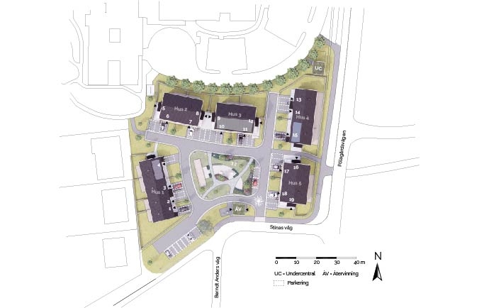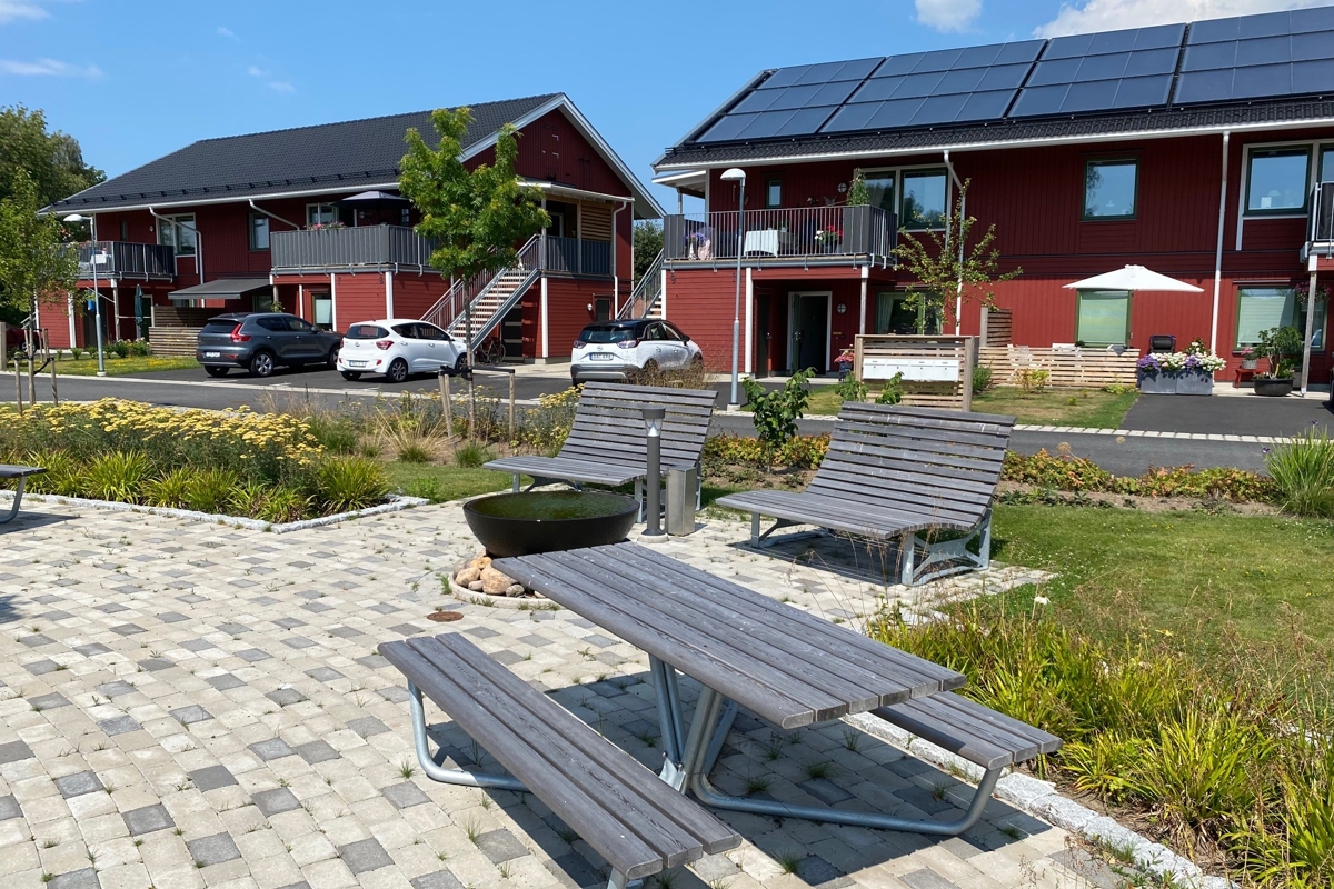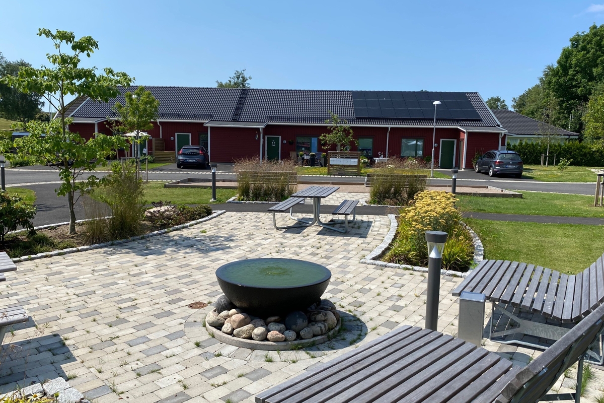 Centralt i området ligger den gemensamma parken med boulebana, vattenspegel och sittgrupper.