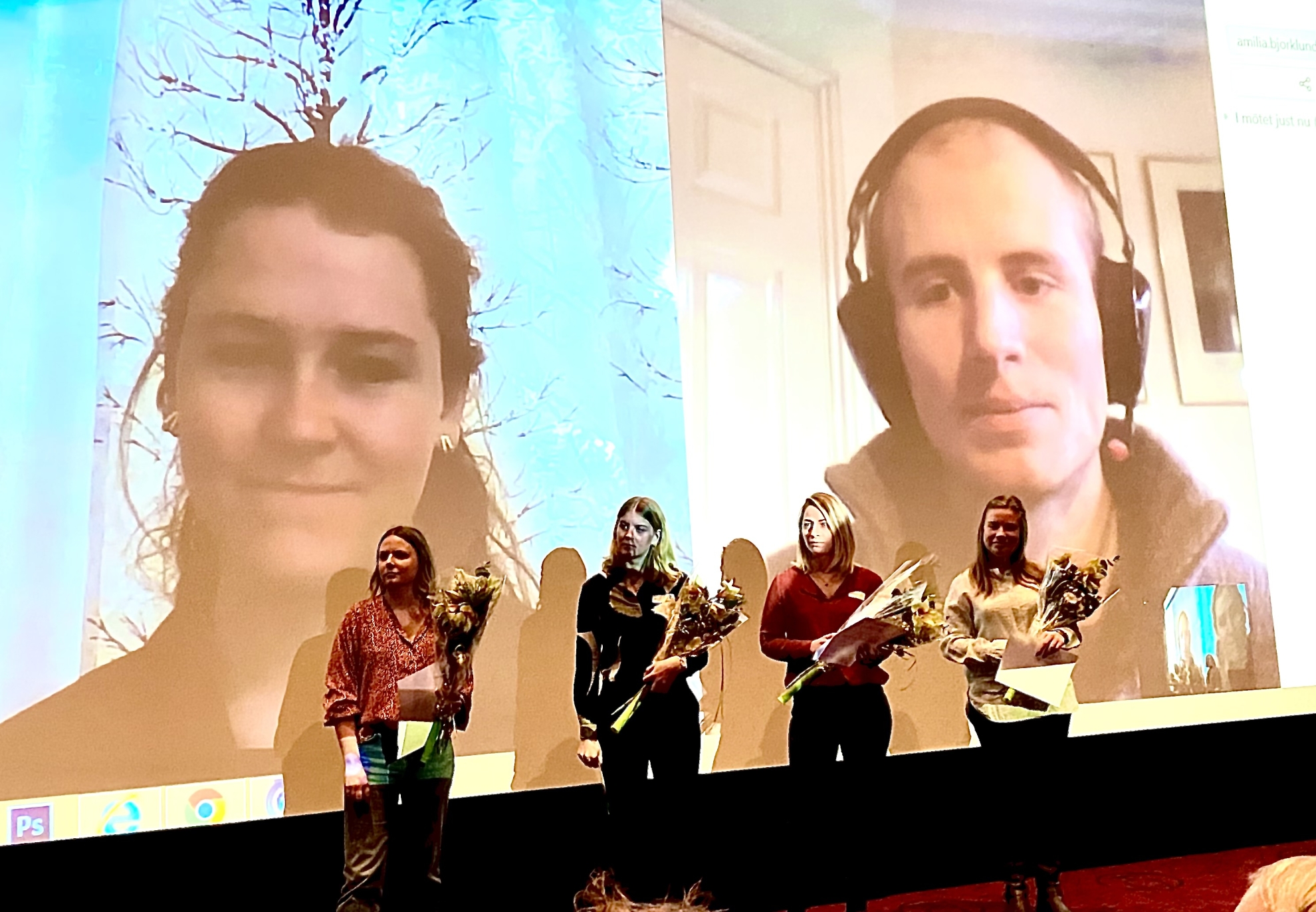 På grund av Corona-viruset fick vi anpassa vår Energikick enligt hälsomyndighetens rekommendationer. Det innebar att vi kollade vaccinpass och höll avstånd. Tyvärr kunde inte två av våra stipendiater närvara utan de fick medverka via teams på stora bioduken.